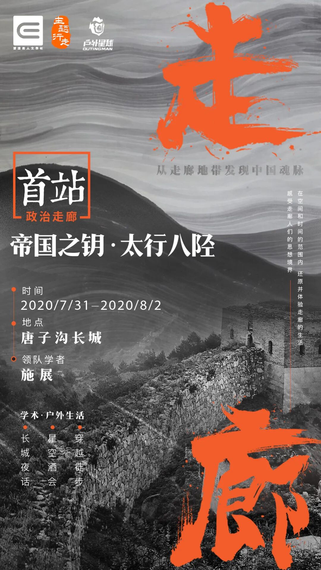 2020年7月开始,学者们将各自出发,走进构建中国历史的六大山脉,走进山间走廊,开启六场“重回走廊”的户外主题行走。他们将分别踏上六大山脉的六条走廊,回到历史现场,在空间和时间的范围内,还原并体验走廊间人们的日常生活,感受廊间人们的思想境界,通过学术思考与户外生存两个方面,切实理解历史中的人如何生存,历史中的社会如何构成。由施展老师带队的“帝国之钥·太行八陉丨政治走廊”,是“重回走廊”户外主题行走的第一站,接下来的五座山脉、五条走廊,我们将继续出发。我们在历史的走廊中,等你。(详情咨询学术助手—小爱,微信号 eidos6719 )7月15日(周三)晚20:00,“施展世界”抖音号直播间,施展和你聊聊“重回走廊,遇见历史”话题。回顾3000年的中国历史,重新理解“何谓中国”。直播间等你加入,期待与你共鸣。