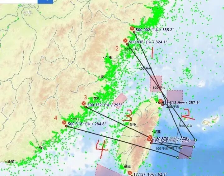 以落弹区四个顶点为圆心,500公里为半径,可以在海岸线确定4个点,分别如图,发射阵地必然位于这四个点之间某个位置,也就是温州到厦门一线区域内。