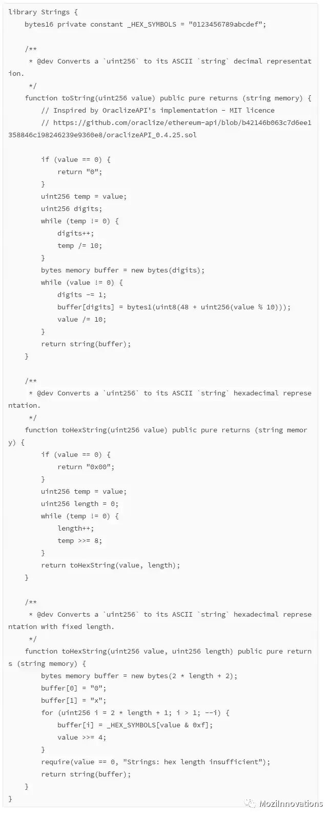 String 库合约是将 uint256 类型转换为相应的 string 类型的代码库,样例代码如下: