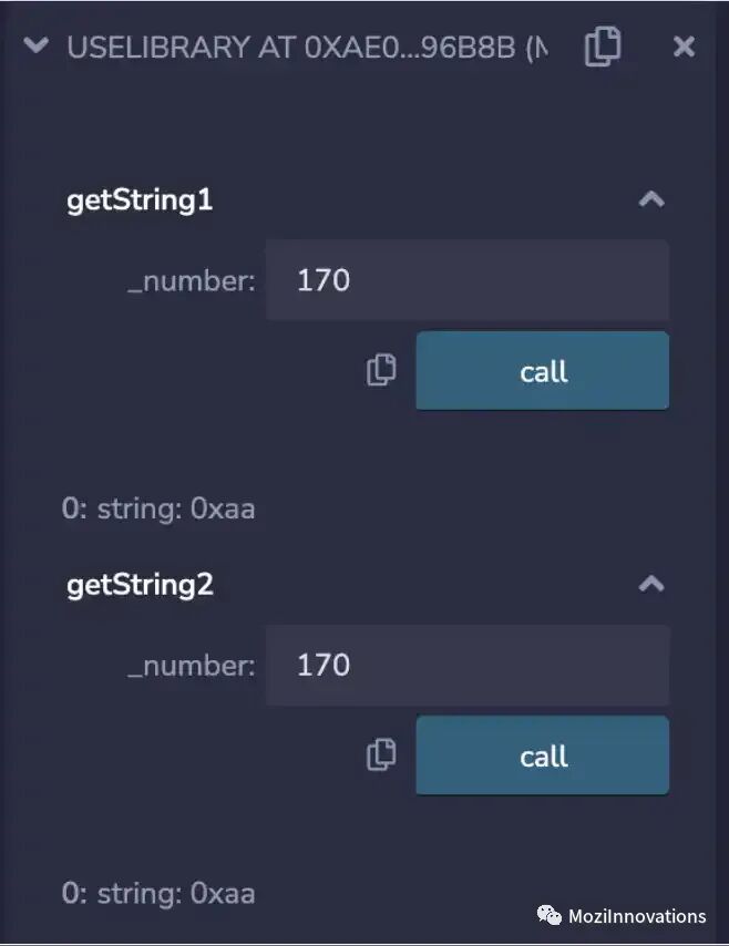 我们部署合约并输入 170 测试一下,两种方法均能返回正确的 16 进制 string 「0xaa」。证明我们调用库函数成功!