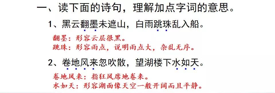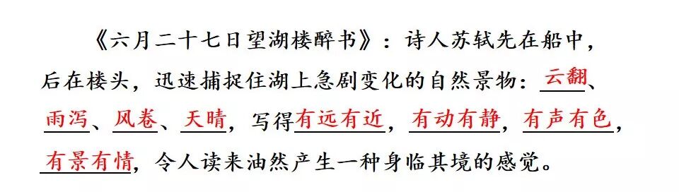 2.《六月二十七日望湖楼醉书》这首诗描写的是夏季的景象。描写的景物有黑云、雨、风、湖水。表达了诗人对大自然的无比热爱的情感。