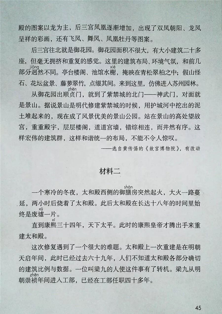 关于故宮 故宫为中国明、清两代的皇宫。依照中国古代星象学说,紫微星(即北极星)位于中天,乃天帝所居,天人对应,是以故宫又称紫禁城。明代第三位皇帝朱棣在夺取帝位后, 决定迁都北京,永乐四年( 1406年)即开始营造宫殿,至永乐十八年(1420年)落成。1911年,辛亥革命推翻了中国最后的封建帝制——清王朝,1924年清帝被逐出宫禁,1925年故宫博物院成立。 正音解词: 矗立(chù) 鳌头(áo) 湛蓝(zhàn) 琉璃(liú) 蟠龙(pán) 中轴线(zhóu) 金銮殿(luán) 击磬(qìng) 檀木(tán) 攒(cuán) 乾清宫(qián) 坤宁宫(kūn) 肃穆(mù) 奏极(zòn) 额枋(fāng) 藻井(zǎo) 矫健(jiǎo) 妃嫔(pín) 翊坤宫(yì) 迥然不同(jiǒng) 多音字: 模:mó模型mú模板 难:nán难题nàn难民 词语解释: 宏大:巨大;宏伟。造句:这座宫殿建筑群规模宏大,气势磅礴。 集中:把分散的人、事物、力量等聚集起来;把意见、经验等归纳起来。文中指故宫建筑群整体上体现了我国古代建筑艺术的独特风格。 俗称:①通俗地叫作。②通俗的名称。本文是第一种意思。造句:自动挡是汽车自动变速器的俗称。 矗立:高耸地立着。 矫健:强壮有力。 绚丽:灿烂美丽。造句:花园里那绚丽的鲜花令人眼花缭乱。 衬托:为了使事物的特色突出,把另一些事物放在一起来陪衬或对照。造句:旺盛的绿叶把红花衬托得更加鲜艳美丽。 肃穆:(气氛、表情等)严肃而恭敬。造句:那位烈士的灵堂布置得庄严肃穆。 迥然不同:形容相差很大,完全不同。迥然:形容差别很大。造句:这对双胞胎的性格迥然不同,一个沉着,一个急躁。 井然有序:指整齐而有秩序。井然:形容整齐的样子。 反义词 : 完整——残缺 精美——粗劣 统一——分裂 集中——分散 笔直——弯曲 矫健——蹒跚 明显——模糊 拥挤——宽松 近义词: 宏大——宏伟 精美——精致 矫健——强健 壮丽——壮观 绚丽——瑰丽 庄严——庄重 和谐——融洽 矗立——屹立/耸立/挺立 井然有序——井井有条 词语辨析: 【盘绕 环绕 缠绕】 三个词都为动词,都有一个共同的语素“绕”,但“绕”的方式不同,适用对象也不同。“盘绕”指围绕在别的东西上面,“环绕”指围绕在别的东西周围,“缭绕”指不必依托某物在空中漂浮。 【壮丽 绚丽】 两个词都为形容词,含褒义,都有好看、美丽的意思。它们的细微差别是:“壮丽”着重表示“雄壮而美丽”的意思,适用于描写河山、事业等,例如“壮丽的事业”。“绚丽”着重表示“色彩鲜明”的意思,适用于描写景物、服饰,例如“绚丽的杜鹃花”。 【壮丽 瑰丽】 都含有“美丽”的意思。“壮丽”指雄壮美丽,侧重于雄壮,多指事业、行为和建筑物,如“故宫建筑群规模宏大壮丽”。而“瑰丽”指异常美丽,多指事物似玉石般瑰奇绚丽,如“瑰丽的鲜花”等。 作者简介: 黄传惕 笔名黄羽 湖南省平江县人,表作有:《天安门颂》、《塞上绿洲右玉》、《彩色的吐鲁番》、《北京,我心中的城》、《绿色的希望》、《故宫博物院》等。 课文简介: 《故宫博物院》原来是一篇广播稿,曾经配上音乐,在中央人民广播电台《祖国各地》节目中播出。播出以后,不少听众要求重播,并且建议将稿件交报刊发表。正好这时候《地理知识》杂志准备开辟“旅游地理”专栏,要去了这篇稿件,在一九七九年十一月号上刊载了,题目就叫“古代艺术的宝库——故宫博物院”。课文《故宫博物院》就是根据这篇文章删改的。 重点语句分析 故宫建筑群规模宏大壮丽,建筑精美,布局统一,集中体现了我国古代建筑艺术的独特风格。 这是本文的中心句。 全文通过介绍太和殿、中和殿与保和殿,乾清宫、交泰殿和坤宁宫等建筑,说明了故宫建筑群规模宏大壮丽、建筑精美、布局统一的特点,而这些特点和它本是封建帝王的居住地,是大一统封建帝国的象征相适应的。 以太和殿为例,介绍其布局和外观,写其高度、面积、格局、色彩,都体现出它的“宏大壮丽”的特点;然后由外观转入写内景,其中写到蟠龙金柱,摹写姿态各异的饰龙,突出了“建筑精美”的特点;“布局统一”的特点体现在很多地方:紫禁城东西南北各有一座城门;城墙的四角上,各有一座角楼;三大殿规模不同,用处不同,而从外观上看属同一组建筑群……当人们在景山高处望故宫时,不由自主地对这“宏伟的建筑群”、“和谐统一的布局”发出惊叹,这些描写既呼应本文的中心句,又写出了参观者由衷的赞叹──精美的建筑文物,智慧的劳动人民,这些都使人们充满了民族自豪感。 文章分析: 一.整体感知 1.故宫的特点是规模宏大壮丽、建筑精美、布局统一。 2.为了清楚地说明故宫的特征,课文按照空间顺序组织材料,由外入内,沿着故宫的中轴线,从南到北,以中间带两边地说明,井然有序。 二.语段精读 阅读课文5—8段,回答下列问题: 1.这四段文字重点在介绍太和殿,请将这四个自然段各加上一个小标题。 5段:太和殿的布局和外观,6段:太和殿写内景,7段:三大殿的位置,8段:太和殿的用途。 2、作者为什么要把太和殿作为解说的重点? 太和殿建筑在紫禁城的中轴线上,是举行重大典礼的地方,是皇帝的宝座所在地,是故宫最大的大殿堂,建筑雄伟壮丽,在整个建筑群中最具代表性。 3、太和殿的主要的饰物是什么?为什么以它作主要的饰物? 龙。龙是皇帝的化身,皇帝自命“真龙天子”,龙是皇权的象征,也就是突出皇权的威严。 4、在介绍太和