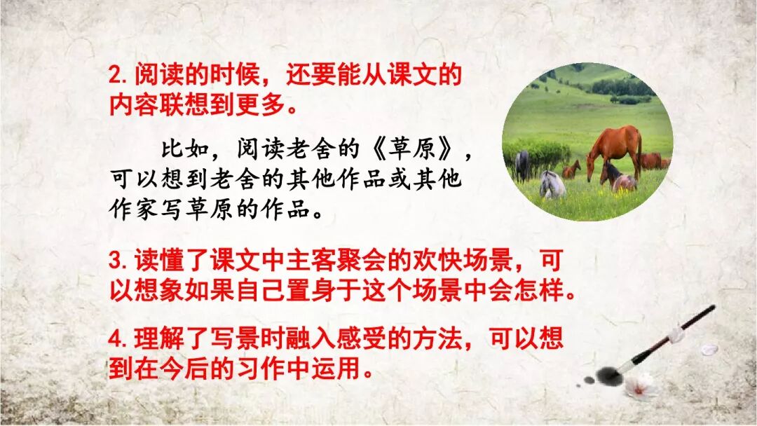 《草原》描景、抒情合一:直抒胸臆抒情,第一次见到草原的惊喜、赞叹和离开时的留恋之情,溢于言表,流于笔端;精笔细描写景,细致入微,形神兼备,生动鲜活,传达出作者满心的喜悦与赞叹。