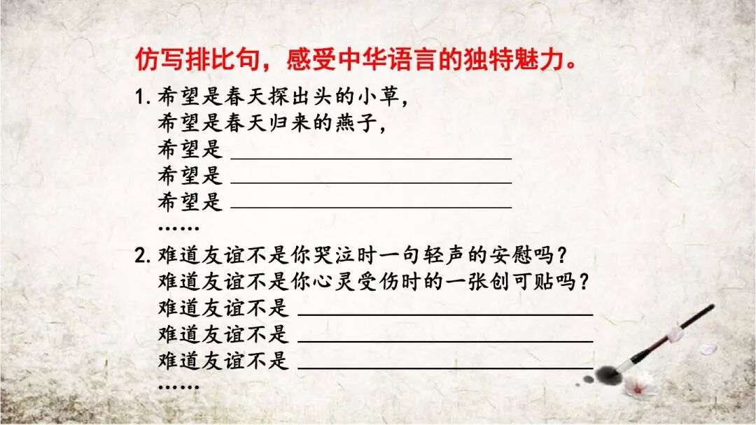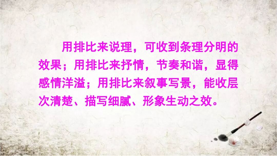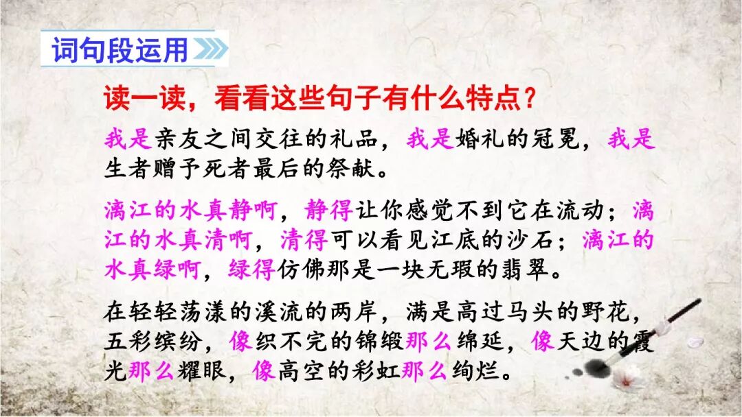表达效果:运用排比,从自身看到的、感觉到的、想到的这三个方面,来具体描写野花“五彩缤纷”的特点,使景物的描写更生动更具体,表达的感情更强烈。