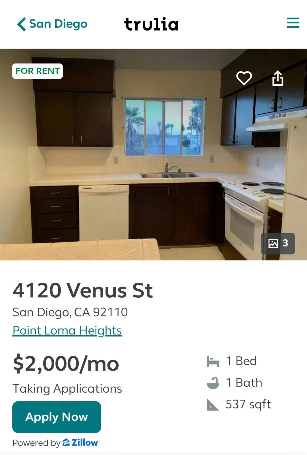 2,000美元能租到什么?在 4120 Venus Street ,一个537平方英尺的一室一厅的工作室,正好需要2,000美元。同理, 4012 Epanow Ave的一室一厅500平方英尺的单间也是如此。