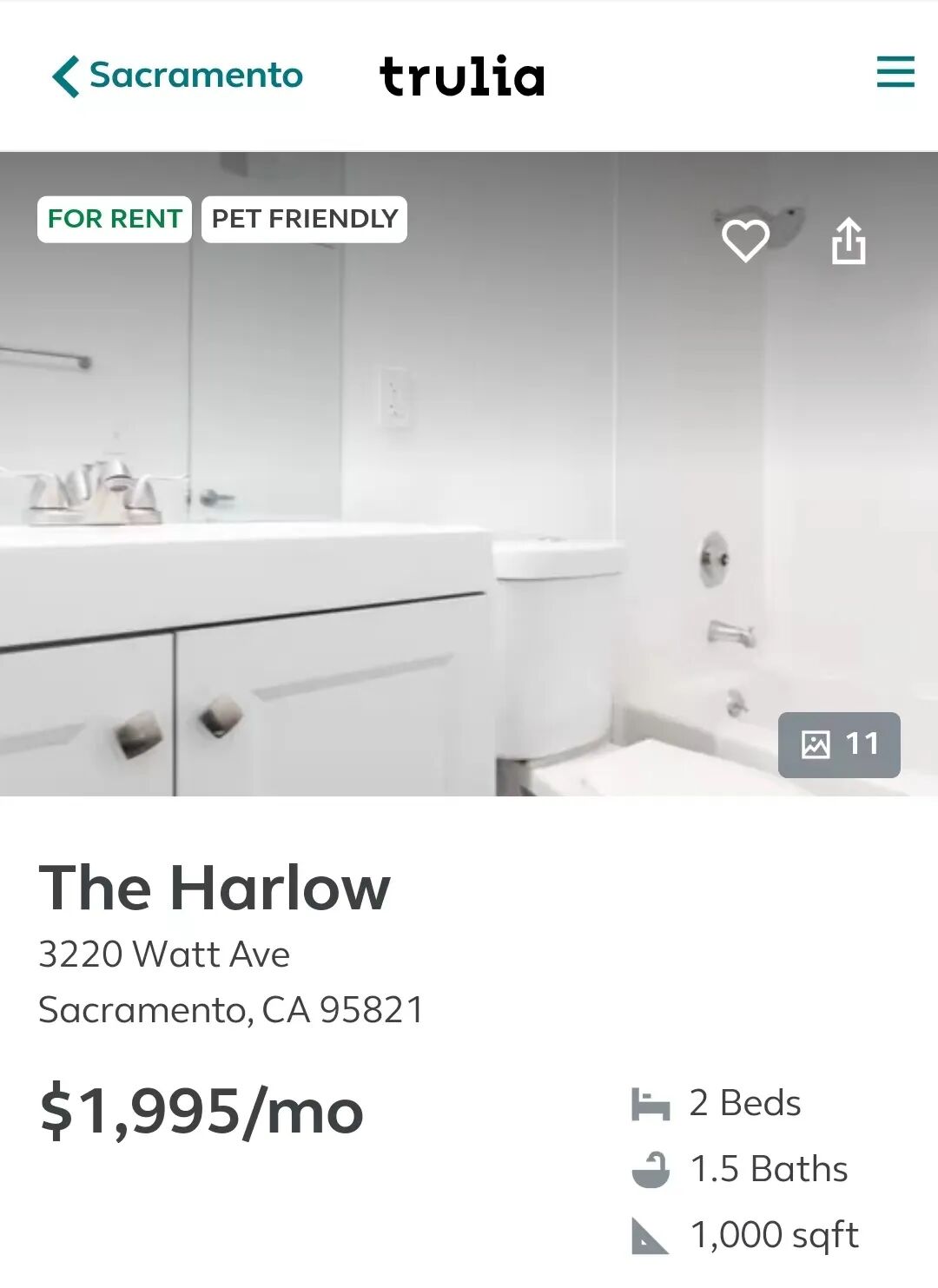 2,000美元能租到什么?位于 3220 Watt Avenue的哈洛公寓(The Harlow),你可以在这里为一个两居室、1.5个卫生间的一千平方英尺的公寓支付$1,995。或者,在8798 La Riviera Drive租一个3房1.5浴室的连排屋,面积为1,191平方英尺。