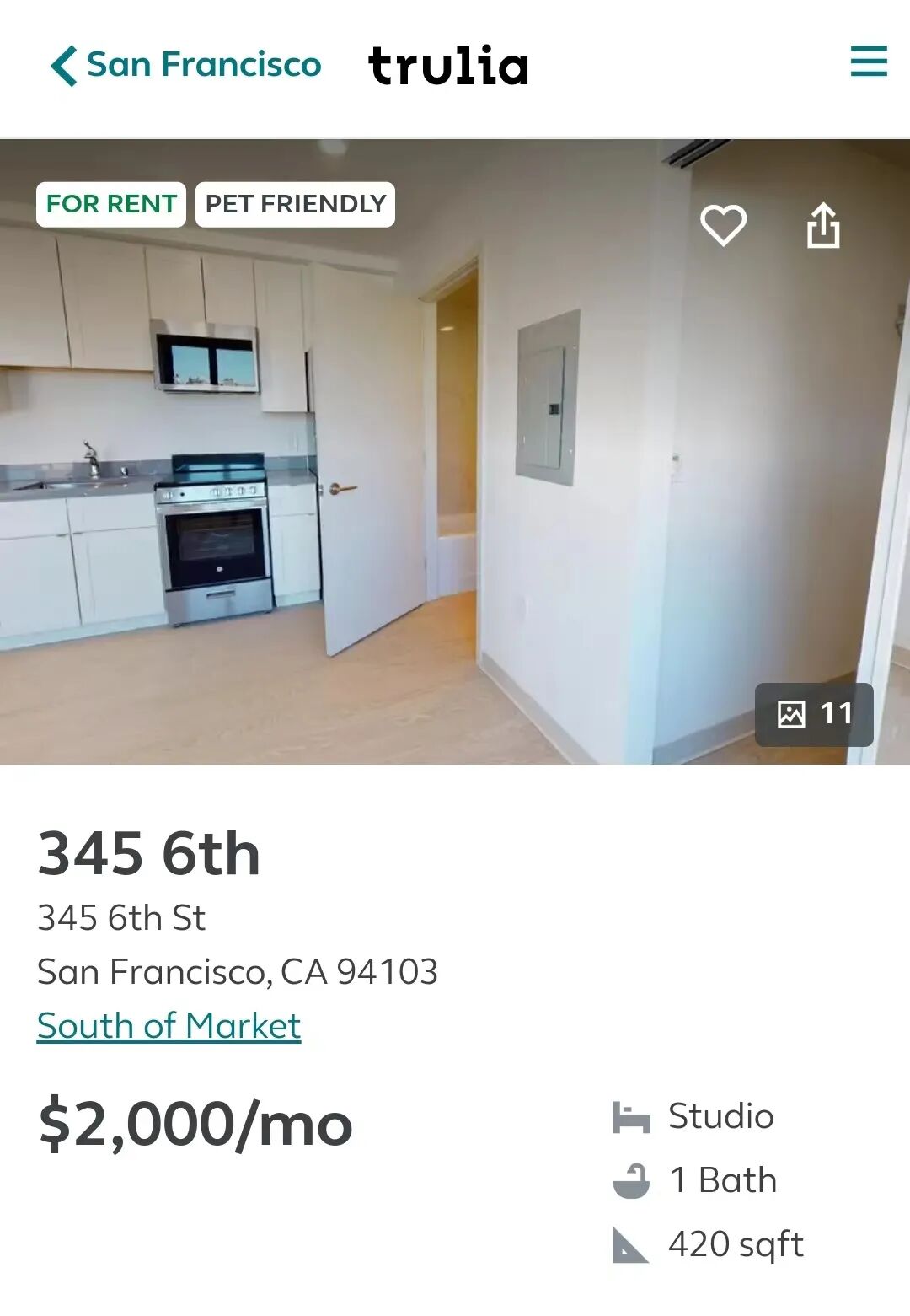 2,000美元能租到什么?在 345 6th Street,一个420平方英尺的带卫生间的单间公寓。稍微便宜一点的,在 1335 Folsom Street,是一个380平方英尺的带卫生间的单间公寓。月租金为$2,000。