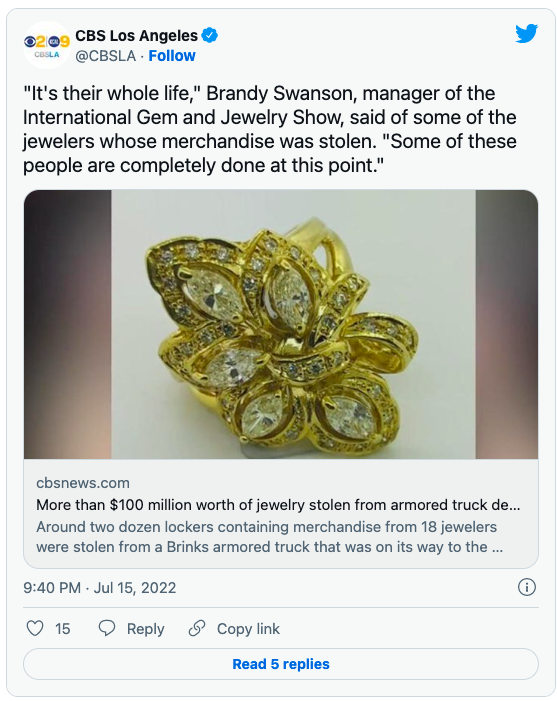 这些珠宝是在7月10日,由旧金山附近的 San Mateo 举行的国际宝石和珠宝展上装载到 Brink's 的装甲车上的,原本要运送去参加 Pasadena 国际宝石珠宝展的,其中包括一些蓝宝石、钻石、珍珠和19k黄金等贵重物品。