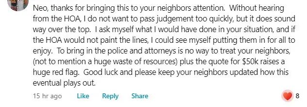 当事人还呼吁,曾经和 HOA 有过相关经历的朋友,或者觉得 HOA 处理问题欠妥,请将此事件转发给更多人,引以为戒,希望华人业主都能团结起来,支持正义,在 Nextdoor、微信、Facebook 等多种社交媒体平台上已经收到了不少回复。