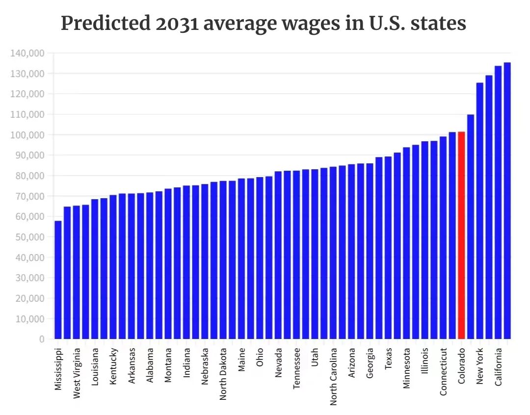 薪资和费用自动化公司 Tipalti 分析了美国各州过去10年的工资和工资增长情况。分析师们随后预测了2031年的平均工资。