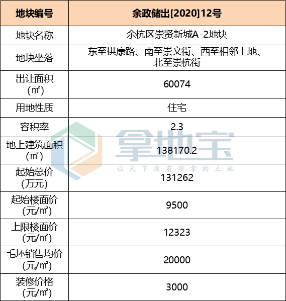 崇贤地块不高于20000元/㎡