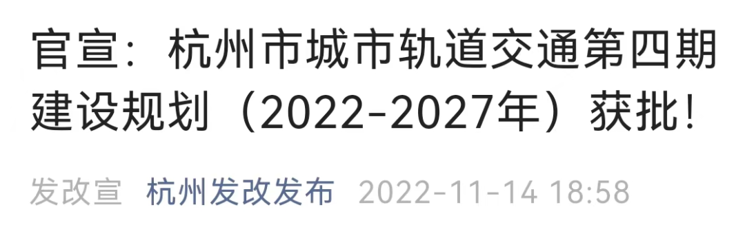 11月14日傍晚,一则官方消息打破了原本宁静的朋友圈和各微信群。杭州发改委官方公众号发布了一条官方消息,“杭州市城市轨道交通第四期建设规划获得国家发改委批复”。顿时,整个朋友圈和微信群全部都是发改委的这条信息。特别是有地铁线路经过的崇贤区域的居民,更是喜出望外!(差点放鞭炮庆祝)