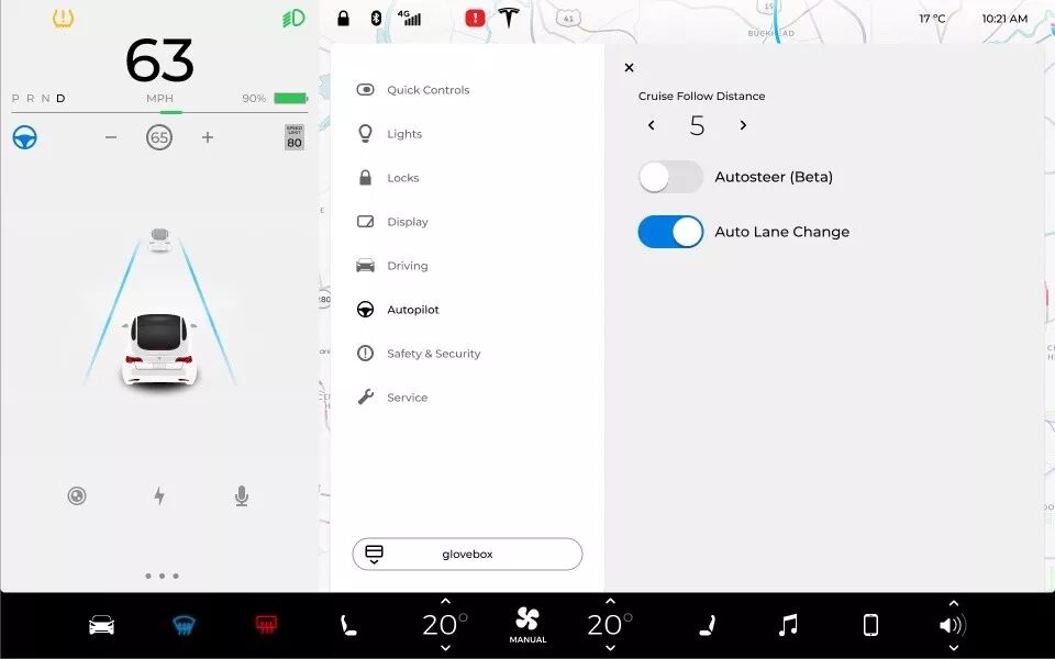 Tesla Model 3 界面设计首先默认展示跟安全驾驶相关的内容,其他功能内容都以模态窗口、浮窗的方式展示,尽可能的降低操作界面的层级,使用完成即收起内容,最大程度提高产品使用效率。因为车载UI特殊的行业属性和功能需求,注定了必须要以安全驾驶为核心,其他娱乐功能为辅助。这个前提也就决定了它的操作层级必须要做到最低。