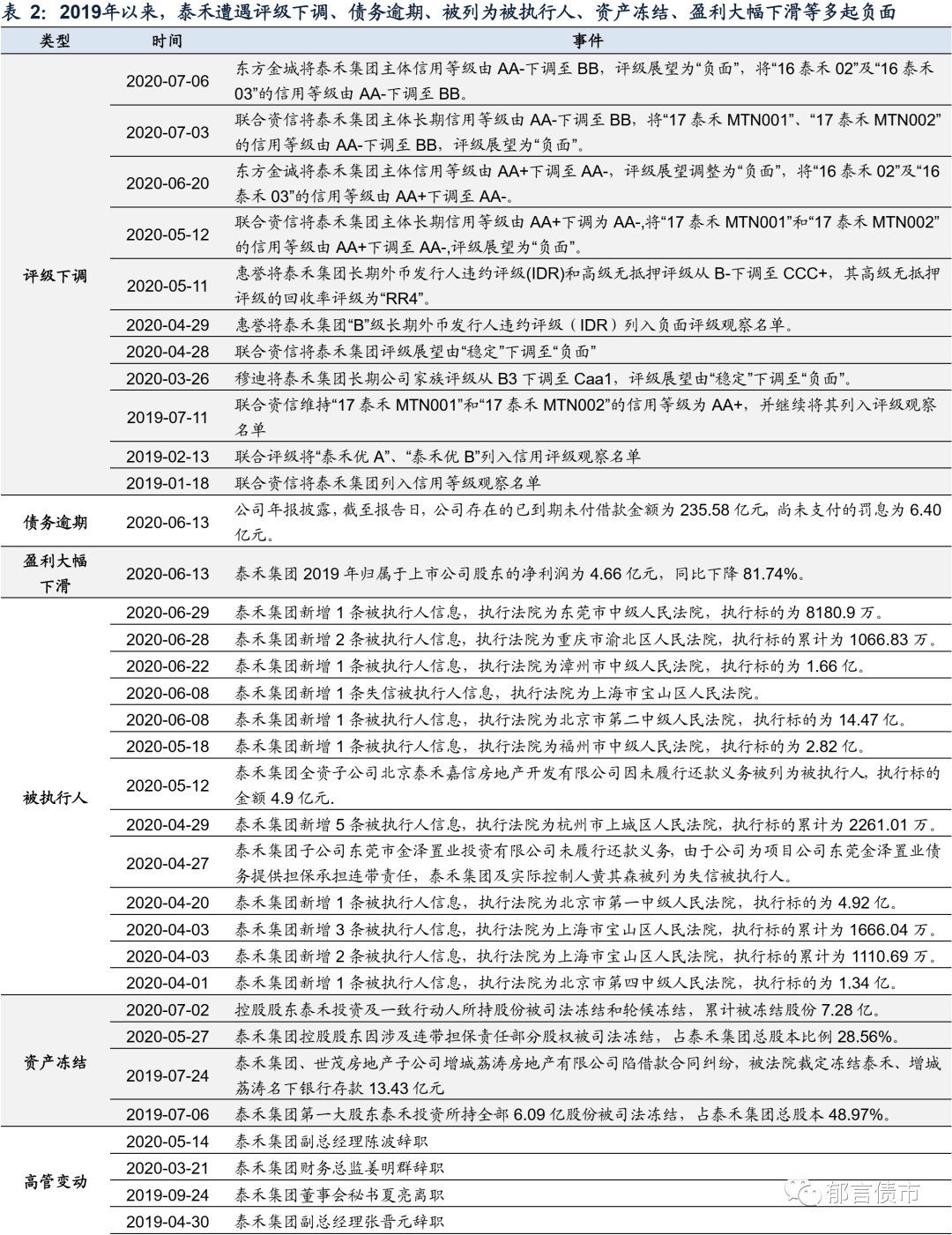 2019年以来,泰禾负面缠身,投资者对其违约有一定预期。评级大幅下调通常是违约的风向标。2020年初以来,首先是境外评级机构穆迪和惠誉下调了泰禾的评级,联合资信在5月12日将泰禾主体评级由AA+下调至AA-,在7月3日进一步下调至BB。除了评级下调,泰禾还出现了债务逾期、被列为被执行人、资产冻结、盈利大幅下滑等诸多负面。而且,公司高管接连离职,管理层不稳定。从负面事件来看,泰禾深陷财务和经营困境,债券违约可能在预期之内。
