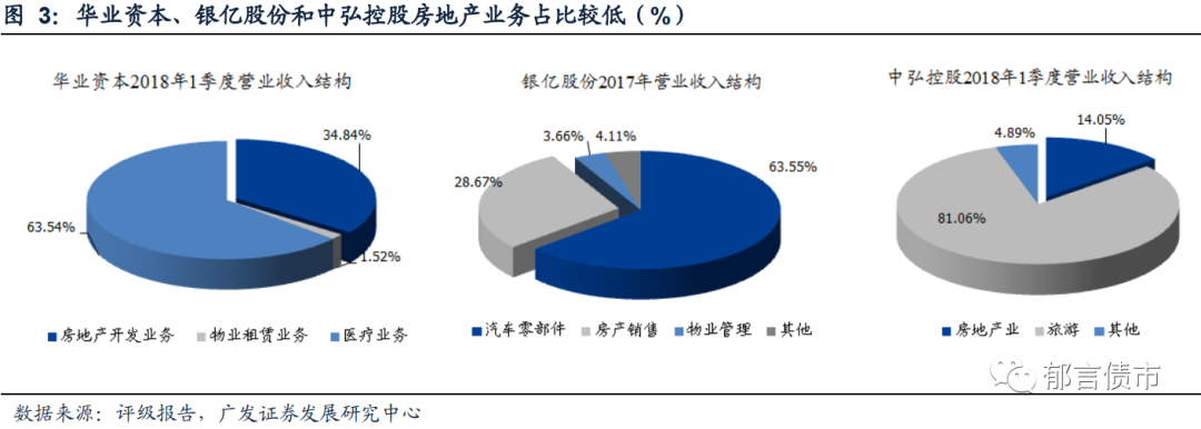华业资本、银亿股份和中弘控股是非典型房企,房地产业务占比较低。华业资本自2015年多元化扩张进入医疗领域,房地产开发业务占比由2015年的95.09%持续下降至2018年1季度的34.84%。银亿股份在2017年1月和10月两次实施重大资产重组,主业由房地产转变为汽车零部件和房地产双主业,2017年末房产销售仅占比28.67%。中弘控股2017年以来,房地产板块销售遭到大量退房,房地产业务恶化,18年1季度仅占比14.05%。