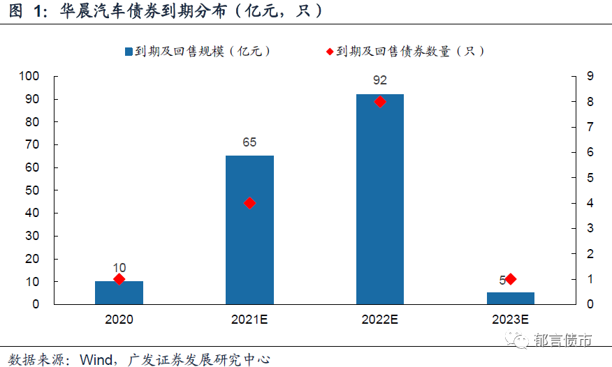 截至2020年10月23日,华晨汽车未偿债券共14只,债券余额合计172亿元。从到期分布看,华晨汽车到期及回售压力集中在2021年、2022年,债券到期及回售规模分别为65亿元、92亿元,涉及债券分别为4只、8只。