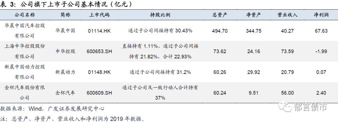 华晨汽车是控股型公司,母弱子强。公司旗下拥有4家上市公司,分别为华晨中国、申华控股、新晨动力和金杯汽车。其中,华晨中国的盈利能力最强,2019年净利润为67.63亿元,持有华晨宝马50%股权。华晨汽车由于承担较高的财务杠杆,以及自身经营的“中华”品牌轿车销售欠佳、盈利能力较弱,2015年以来母公司报表净资产为负,且缺口不断扩大。