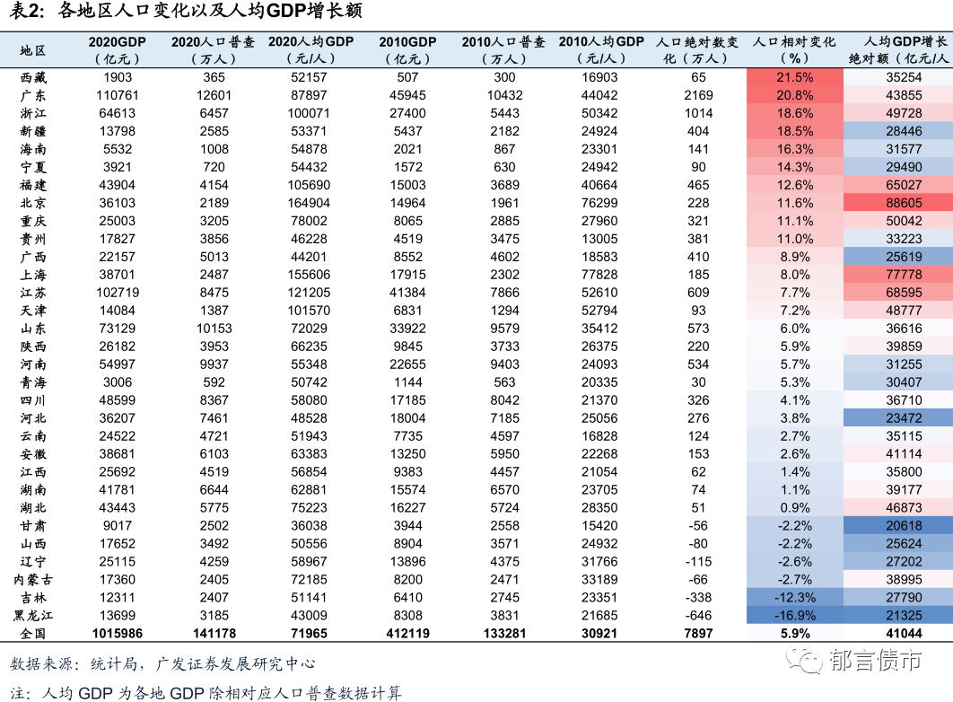 人口增速方面,我们可以将2010年到2020年人口增速较高的省份分成两类:自然增长率较高或者人口流入较大。具体来看,一是西藏、新疆、海南、宁夏、贵州和广西等少数民族聚集地区,人口增长较快,可能是自然增长率较高。二是广东、浙江、福建、北京、重庆、上海、江苏等人口流入大省,人口增长较快。
