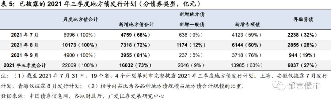 截至2021年7月31日,19个省、4个计划单列市已经披露第三季度地方债发行计划。上海、安徽仅披露7月地方债发行计划,青海仅披露8月地方债发行计划。合计计划发行规模22069亿元(新增地方债16032亿元、再融资债6037亿元)。7月、8月、9月发行比例分别为32%、46%、22%。