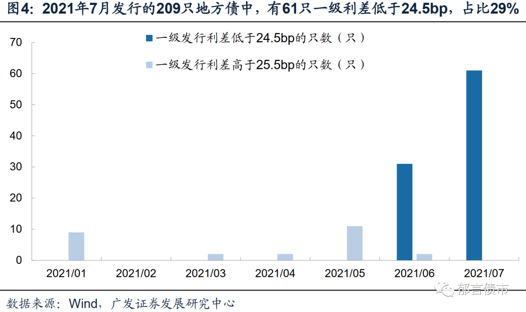从2021年1-7月来看,共发行864只地方债,其中92只一级发行利差低于24.5bp,占比11%。26只一级发行利差高于25.5bp,占比3%。6月以来,低于24.5bp的发行只数明显增加。