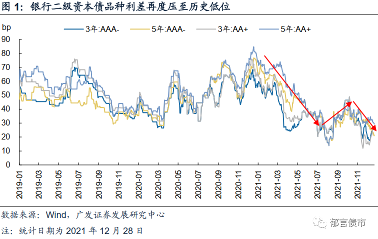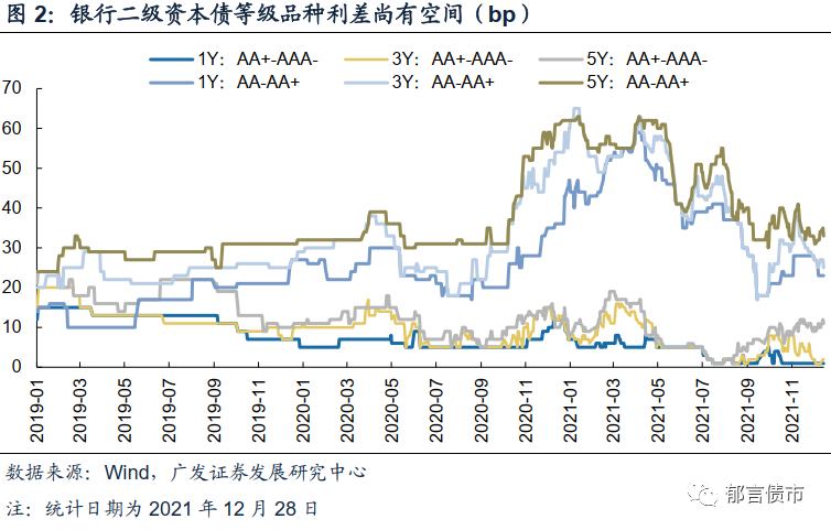 第二阶段,从8月下旬至10月中旬,8月24日,监管要求六大行及其理财子公司10月底之前完成存量产品净值化整改,首当其冲受影响的是此前以摊余成本法计量来平滑理财产品净值的银行资本债,遭遇机构抛售。至10月中旬,各等级二级资本债品种利差走扩25bp左右。第三阶段,从10月中下旬以来,由于银行二级资本债和永续债具备高票息、流动性好等优势,配置力量仍然较强,收益率再度下行。截至2021年12月28日,3Y品种利差压缩23bp左右,5Y品种利差收窄15-19bp,已再度行至历史低位附近水平。国股大行资本债利差行至低位,当前性价比已经偏弱,但等级利差尚有空间。2021年以来,AAA-和AA+二级资本债与AA品种等级利差分化,AA+-AAA-利差持续处在低位,利差水平多在10bp以下,1YAA+-AAA-等级利差目前已不到1bp。但是AA-AA+等级利差处于震荡下行阶段,目前仍处高位,多在25-35bp之间。适度下沉,往下挖掘优质城农商行的投资机会,可能也是当下银行资本债投资的一种潜在选择。![]()