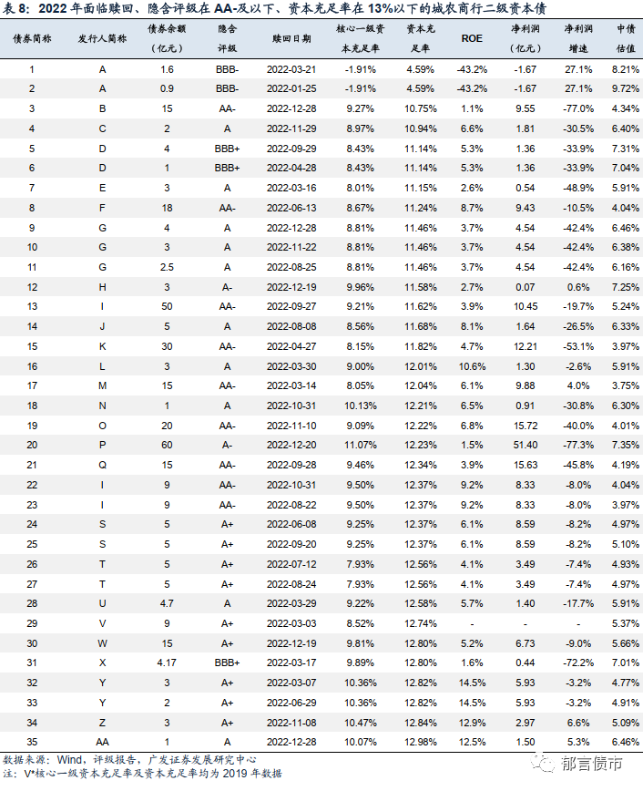 对银行二级资本债或将面临的到期不赎回风险,我们也进行了梳理。在将于2022年面临赎回的二级资本债中,我们筛选出债券隐含评级在AA-及以下、2020年银行资本充足率在13%以下的二级资本债(文中列表为脱敏数据)。其中,A银行2020年资本充足率仅为4.59%,核心一级资本充足率为-1.91%,没有达到监管要求。此外,10家银行资本充足率在12%以下,且多数银行净利润大幅下降,面临较大的资本补充压力,赎回二级资本债后资本充足率可能将大幅下降至监管指标附近水平甚至突破监管指标。
