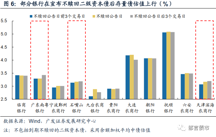 与此同时,银行不赎回到期二级资本债可能也会导致存量债估值上行,较为明显的是广东南粤银行、石嘴山银行和天津滨海农商行。广东南粤银行在宣布不赎回二级资本债前存量债平均估值稳定在3.29%,3个交易日后存量债估值明显上行,上行幅度在14bp。石嘴山银行和天津滨海农商行在宣布不赎回二级资本债前3个交易日开始存量债估值水平持续上行,幅度分别为5bp、13bp。其他银行存量债平均估值变动不大,可能因为市场对其不赎回早有预期,不赎回风险已被消化。![]()