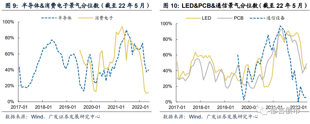 (1)半导体&PCB&LED:包括半导体&PCB&LED在内的电子链条,2022年3月以来景气度下行明显,5月出现小幅反弹。