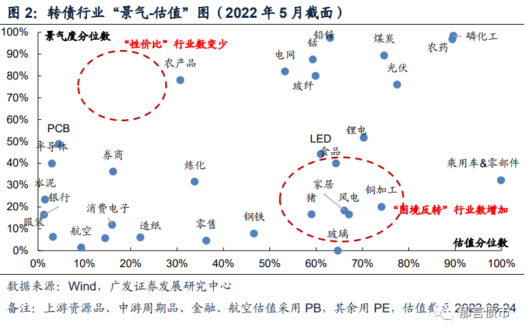 “困境反转”区间的转债行业。年初以来的典型行业包括生猪、航空等,其估值分位数水平已回升至历史中枢水平,而景气度仍在历史底部分位数水平,或预示市场提前交易景气度的反转。除此之外,玻璃、风电、家居等行业由于近期估值上行,同时景气度并无好转,开始贴近“困境反转”区间,或预示市场提前交易其远期景气上行带来的弹性。