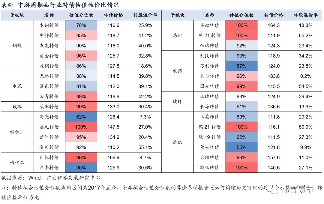 中游周期品行业中,拟合估值分位数相对较低的个券,包括本钢转债、海亮转债、山鹰转债、鹰19转债、景兴转债,可结合正股情况适当关注。
