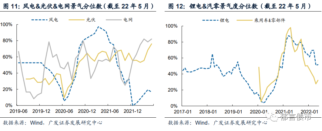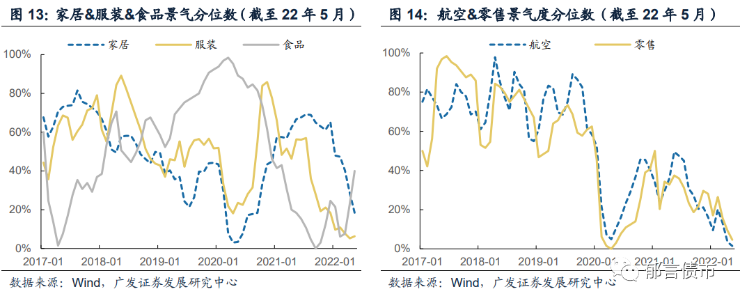 从行业景气度变动趋势来看,2022年5月景气度出现上升的行业包括煤炭、生猪、磷化工、炼化、半导体、LED、PCB、消费电子、光伏、锂电、电网、乘用车&零部件、服装、食品、银行等,其中光伏景气度分位数环比+8pp至76%,食品景气度分位数环比+17pp至40%;景气度出现明显下降的行业包括铅锌、钴、农产品、钢铁、水泥、玻璃、造纸、农药、玻纤、风电、家居、零售、航空、券商、建筑,其中农产品、钢铁、家居等行业景气度下滑幅度较大,农产品景气度分位数环比-17pp至78%,钢铁景气度分位数环比-17pp至8%,家居景气度分位数环比-10pp至18%。