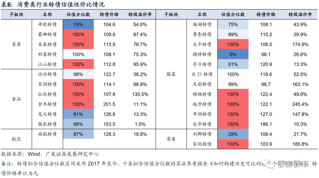 消费类行业中,拟合估值分位数相对较低的个券,包括帝欧转债、海澜转债、孚日转债、利群转债、龙大转债,可结合正股情况适当关注。