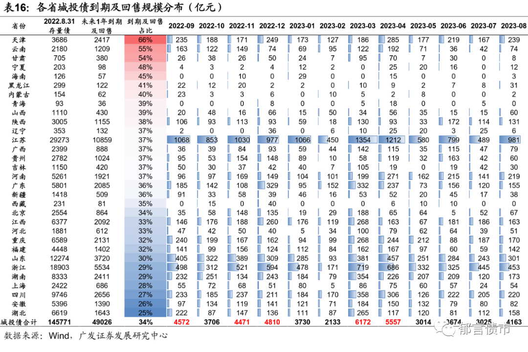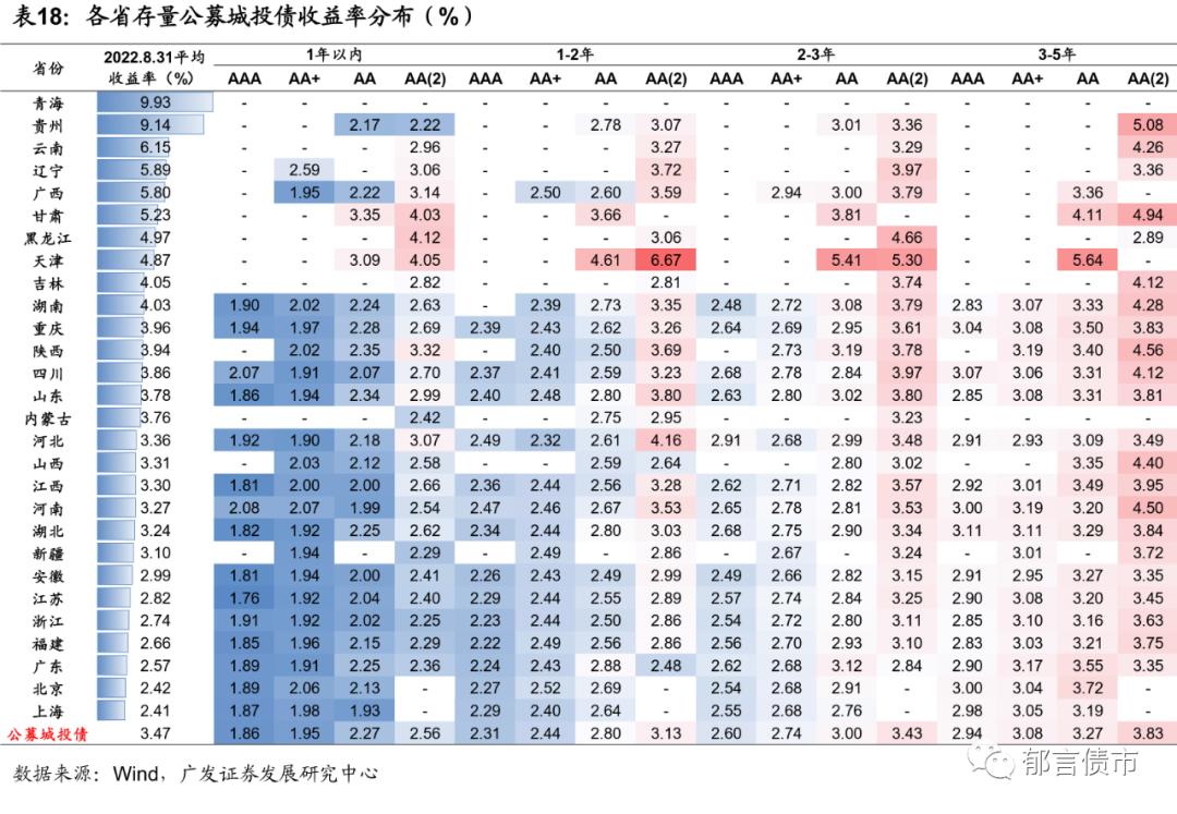 城投债投资回归核心区域,关注弱城投到期分布,防范估值波动风险。往后看,城投债再融资压力或成为市场关注焦点。2022年9-12月,城投债到期及回售规模相对较大,而区县级、低评级城投债发行仍偏紧。2022年1-8月各地区土地出让金对城投有息债务和政府债利息的覆盖比例大幅下降,叠加地产销售疲软,市场对城投债中短期的偿债能力存在隐忧,导致风险偏好下降。因此,城投债投资宜回归核心区域,聚焦浙江、江苏、广东、福建、安徽,隐含评级AA+和AA拉久期至3-5年;对于债务率适中、城投到期压力可控的区域,高等级拉久期的性价比或高于短久期下沉策略。