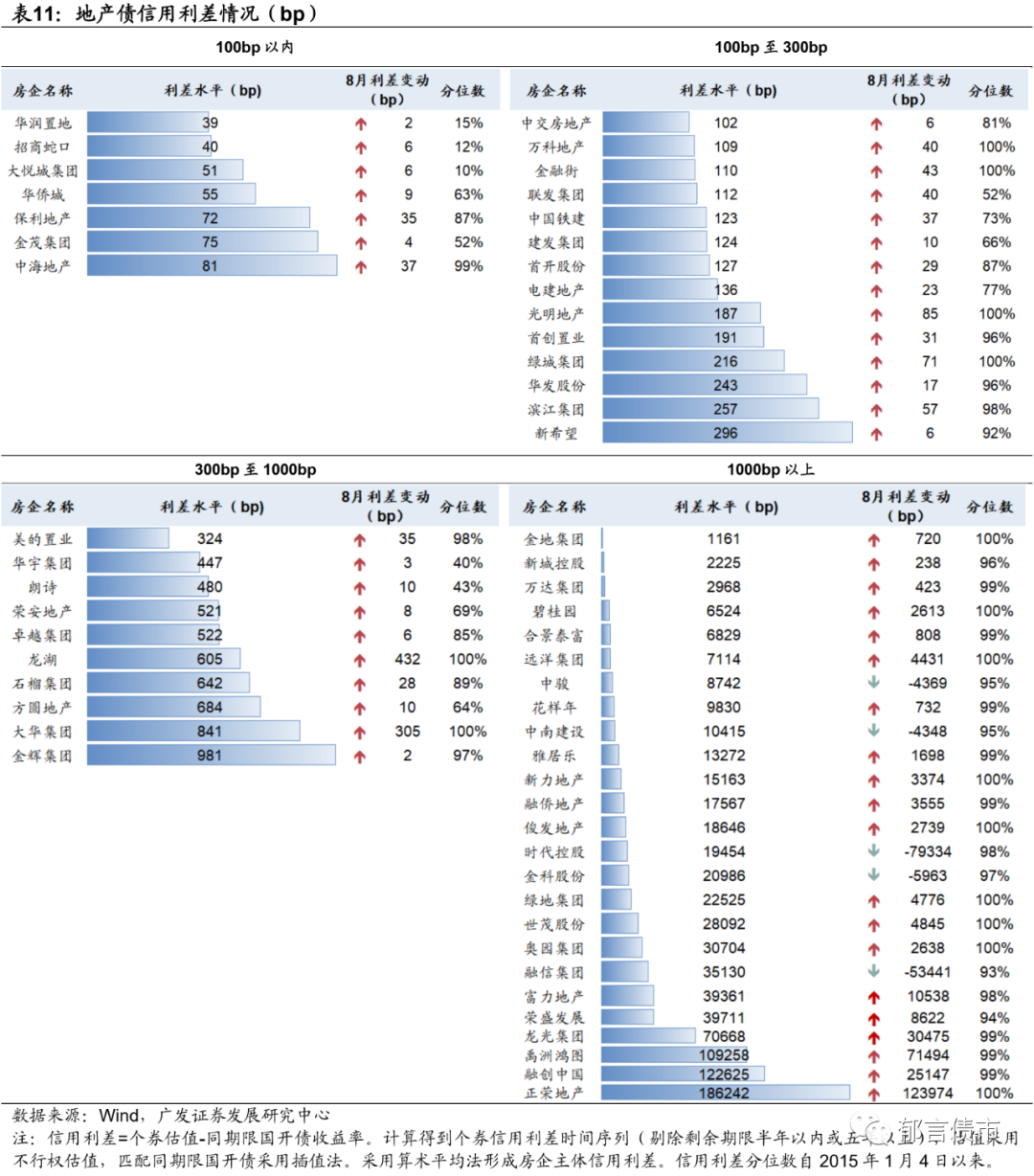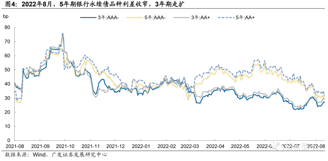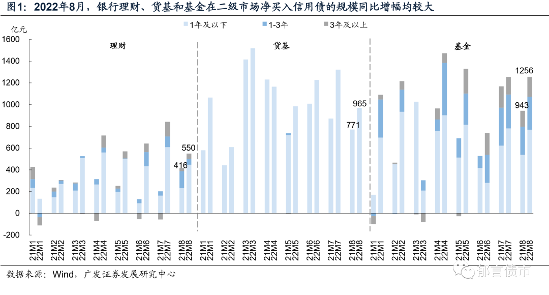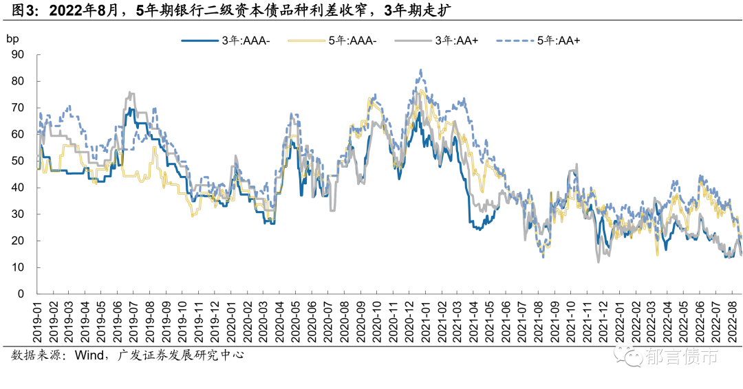 2022年8月,信用债配置需求仍强,银行理财、货基和基金在二级市场净买入信用债的规模同比增幅均较大。具体来看,8月银行理财净买入信用债规模为550亿元,去年同期为416亿元,主要是1年以内信用债买入量大幅增加。货基净买入信用债规模为965亿元,较去年同期增加了194亿元。基金净买入信用债规模为1256亿元,高于去年同期的943亿元。8月15日央行降息,长端利率打开下行空间,8月各评级及期限信用债收益率均下行。从中短期票据收益率表现看,5Y收益率下行大于1Y和3Y;AA+、AA表现也优于AAA。城投债也是5Y表现更优,AA和AA(2) 5Y收益率下行幅度较大,分别下行19bp、26bp。从信用利差看,产业债和城投债利差大多被动走扩。目前,短久期信用债的利差处于历史低位,截至2022年8月31日,各评级1Y、3Y大多处于2015年以来的10%以下分位数。相应地,2022年8月信用债拉久期策略依然占优。2022年8月,从信用债总指数看,1-3年、3-5年指数收益率均为0.32%,高于1年以下的0.21%。隐含评级AAA 3-5年表现最优,指数收益率为0.59%。8月信用债发行额上升,到期量仍然较大,净融资额有所回升。2022年8月,信用债发行额为1.15万亿元,较7月的9964亿元上升,不过低于去年同期的1.27万亿元。与此同时,8月到期规模较大,为1.02万亿元,高于7月的9706亿元。8月净融资额为1322亿元,环比7月增加1063亿元。2022年8月,信用债净融资同比依然呈现下降趋势,净融资同比下降1921亿元,其中,城投债净融资为1599亿元,同比下降1075亿元,产业债净融资为-278亿元,同比下降846亿元。1-8月合计来看,信用债净融资为1.69万亿元,同比增加1811亿元,主要由于上半年产业债发行回暖。其中,城投债净融资1.25万亿元,同比减少4169亿元。而产业债净融资4415亿元,2021年同期净融资为-1564亿元,净融资规模较大的行业包括建筑装饰、综合、化工、交通运输、非银金融等。2022年8月,各省城投债净融资分化,区县级城投净融资同比持续为负。2022年1-8月,省级城投债净融资为1094亿元,同比增加958亿元;市级城投债净融资为4552亿元,同比减少1312亿元;区县级城投债净融资为3644亿元,同比大幅减少了3284亿元。其中,广东、江苏、云南、山东、江西和广西的市级城投债净融资同比下滑较多,浙江和江苏区县级城投债净融资同比分别减少了1488亿元和1291亿元。地产债方面,各类型房企净融资均为负,地产债总体净融资为-159亿元。2022年8月,民企地产债净融资缺口相对较大,仅美的置业、龙湖拓展和滨江发行了债券,合计27.4亿元,到期规模达111亿元,净融资额为-84亿元。央企和地方国企净融资额同比变化不大,2022年8月净融资额均为-33亿元。从存量债收益率分布看,2022年8月信用债收益率下行,收益率3%以下的债券余额占比小幅升高。截至2022年8月31日,公募信用债中,行权收益率3%以下债券余额占比达72%,高于7月末的71%和6月末的55%;3%-3.5%余额占比为13%,3.5%-4%余额占比4%。2022年8月,银行资本债到期收益率全线下行,其中,5Y品种收益率表现占优,下行幅度在13-16bp,1Y和3Y下行5-8bp。信用利差方面,各期限银行资本债信用利差变动出现分化,短久期利差整体收窄,1Y利差压缩20bp以上,3Y利差压缩13-17bp。而由于8月长久期利率债降幅较大,5YAAA银行资本债信用利差被动走扩1-4bp,5YAA+银行资本债利差压缩幅度也较小。银行资本债相对同期限城投债的票息优势仍较弱,AAA-银行二级资本债信用利差仅比同期限AAA城投债高4-7bp,银行永续债高14-17bp。目前,短久期银行资本债信用利差均处于2019年以来的较低水平,分位数均在6%以下,中长久期银行资本债利差分位数普遍在10%-15%左右。2022年8月,银行资本债和普通金融债之间的品种利差分化,3年期品种利差走扩,5年期品种利差压缩。截至2022年8月31日,3YAAA-和3YAA+银行二级资本债品种利差较2022年7月29日分别走扩3bp、2bp;5YAAA-和5YAA+品种利差分别压缩13bp、12bp。银行永续债方面,3YAAA-和3YAA+银行永续债品种利差分别走扩5bp、4bp;5YAAA-和5YAA+品种利差分别收窄8bp、9bp。目前,银行二级资本债品种利差均在20bp以下,银行永续债品种利差在30bp左右,均处于历史低位。2022年8月,银行二级资本债换手率维持上升,大于同期城投债。2022年9月,银行二级资本债和银行永续债换手率分别为17%、16%,分别较7月上升2、3个百分点。8月城投债换手率也小幅提升,为12%,不过仍不及同期银行资本债。8月城投债收益率下行,短久期下沉和高等级拉久期策略并存我们以2022年8月31日存量公募城投债为样本,计算每只城投债8月31日较7月29日行权收益率的变动值,并得到各省城投债分隐含评级、行政级别、期限的收益率平均变动值。8月城投债下沉策略仍占优,大多数省份公募城投债隐含评级AA-、AA(2)的收益率表现优于AA+、AA。分期限看,1年以内和3-5年收益率下行幅度相对较大,或指向投资者采用城投债短久期下沉、高等级拉久期的差异化策略。分省份看,除了青海,其余省份公募城投债收益率均下行,大多下行10bp以上。2022年8月,5年期LPR下降15个基点,监管推动中债增担保头部房企发债,但由于地产销售疲软,市场对民营房企避险情绪浓厚,国企和民企分化加剧。8月,房企利差全线走扩,部分民营房企利差走扩幅度较大。头部民企龙湖利差大幅走扩了432bp。公众企业的远洋、金地,利差走扩幅度也较大。央企和地方国企的利差出现不同幅度走扩,其中,光明地产、金融街、联发、中国铁建、中海、保利利差走扩超过