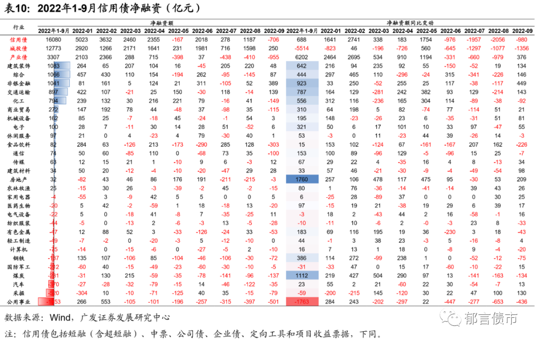 1-9月合计来看,信用债净融资为1.61万亿元,同比增加688亿元,主要由于上半年产业债发行回暖。其中,城投债净融资1.28万亿元,同比减少5514亿元。而产业债净融资3307亿元,2021年同期净融资为-2895亿元,净融资规模较大的行业包括建筑装饰、综合、非银金融、交通运输、化工等。