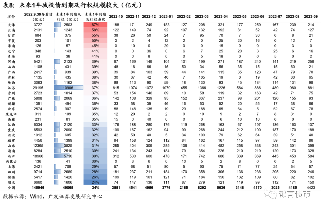 展望未来,在城投债分化可能加剧的背景下,城投债宜适当缩小风险敞口,一方面,警惕非标占比高、土地出让金难以覆盖债务利息、综合财力对政府性基金收入依赖度大且土地出让金大幅下滑、未来1年内到期及行权城投债规模较大的区域;另一方面,也需防范部分经济财政实力较强省份的尾部城投的估值波动风险。