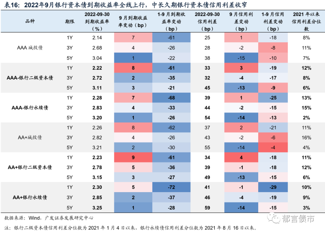 2022年9月,银行二级资本债和普通金融债之间的品种利差走扩,3年期走扩幅度更大。截至2022年9月30日,3YAAA-和3YAA+银行二级资本债品种利差较2022年8月31日分别走扩1bp、6bp;5Y银行二级资本债品种利差走扩幅度较小,在0-2bp之间。银行永续债品种利差变动分化,3年期品种利差走扩,5年期收窄。3YAAA-和3YAA+银行永续债品种利差分别走扩3bp、2bp;5Y银行永续债利差小幅收窄0-1bp。目前,银行二级资本债品种利差均在20bp左右,银行永续债品种利差在30bp左右,均处于历史低位附近。