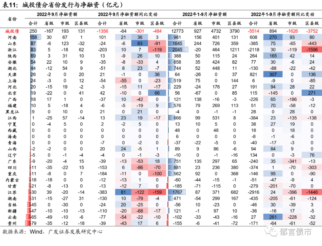 2022年9月,各省城投债净融资分化,区县级城投净融资同比持续为负。2022年1-9月,省级城投债净融资为927亿元,同比增加894亿元;市级城投债净融资为4732亿元,同比减少1626亿元;区县级城投债净融资为3790亿元,同比减少了3752亿元。其中,江苏、广东、云南、广西、江西和浙江的市级城投债净融资同比下滑较多,浙江和江苏区县级城投债净融资同比分别减少了1596亿元和1446亿元。