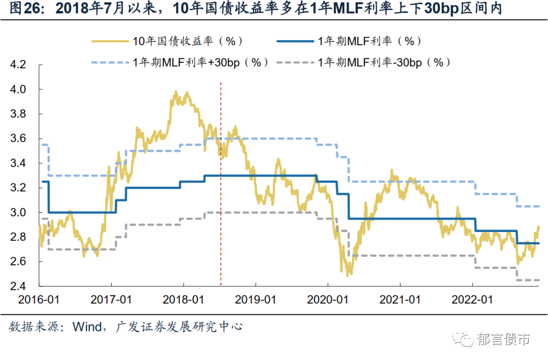 回顾2018年7月以来,1年期MLF利率逐渐成为10年国债收益率的一个重要参考点位,而并非作为上限。2018年7月至2022年12月初,10年国债收益率与1年期MLF利率之差在[-30,+30]bp区间内的交易日数,占全部交易日数的87.3%。
