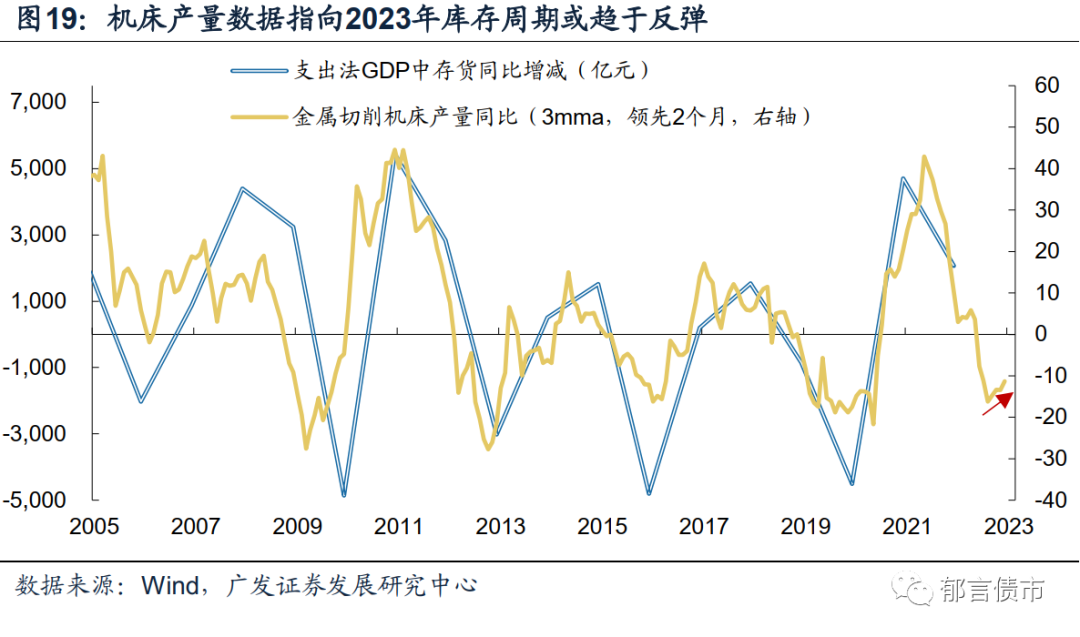 库存周期见底回升,也指向利率中枢可能抬升。库存周期往往略微滞后于经济周期和大宗商品价格周期,在判断短期利率走势时,库存周期提供的信息相对滞后。但在年度判断时,库存周期可以给出一个全年维度上的大致方向。根据机床产量、CRB工业原料价等指标推断,2023年库存周期可能见底回升,时点或在二季度或三季度。参考以往周期,库存周期上行,也往往伴随利率中枢上行。