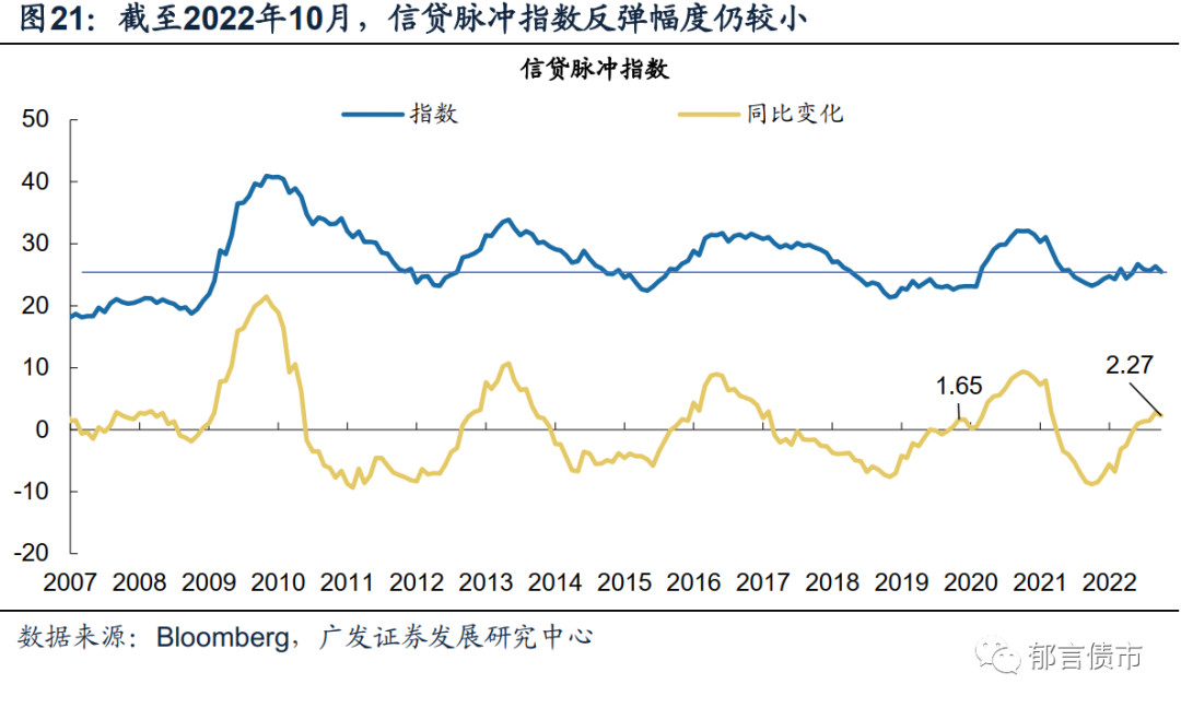 基于货币-信用周期框架:2023年,关注宽信用的幅度,待经济确立恢复趋势,货币或从宽松切换回常态。信用方面,2022年的稳信用状态与2019年较为相似,社融同比增速趋于震荡,与2020年的宽信用状态下社融增速大幅上行形成对比。2022年1-10月,信贷脉冲指数同比出现小幅反弹,主要是基数因素推动,指数自身并未形成上行趋势。预计2023年宽信用的程度可能介于2020和2022之间,以保持宏观杠杆率基本平稳、平衡稳增长和防风险。地产融资放松,随着疫后经济的反弹,房企融资、居民按揭贷款可能有所恢复。2022年1-10月,居民短期贷款同比少增6338亿元,居民中长期贷款同比少增2.79万亿元,如其在2023恢复至2021水平,对社融同比的额外拉动约为1个百分点。