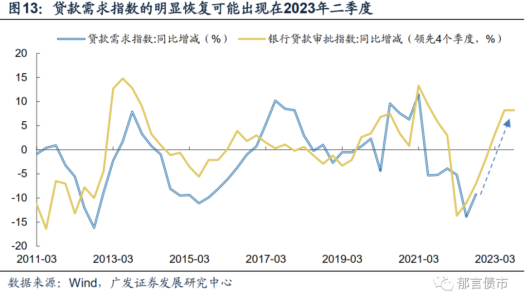 从票据利率来看中小企业的融资需求情况,2022年三季度票据融资利率为1.92%,较二季度的1.86%小幅回升,但仍处于历史低位附近。观察央行调查的贷款需求指数也可以得到类似结论,通过回溯历史数据发现贷款审批指数领先需求指数约1年时间,据此推断,贷款需求指数可能在2023年二季度出现明显的同比正增长。结合以上分析,我们倾向于认为,2023年一季度货币政策可能延续宽松,不排除继续降准降息的可能。