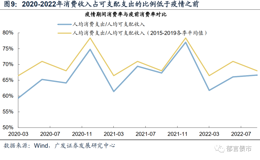 消费恢复程度,可能是2023年市场密切关注的点之一。从人均收入和支出,估算居民超额储蓄的规模近5万亿元,可能成为助推2023消费反弹的重要因素。2020-2022年,居民消费倾向与疫情之前存在不同程度的下降,我们根据城乡一体化调查季度数据中的全国居民人均可支配收入、全国居民人均消费支出来测算超额储蓄。该方法的假设是居民的人均可支配收入,去向为消费支出或储蓄,这种方法将近几年疫情等因素导致居民收入增长放缓纳入考量。具体为,先计算2015到2019年各个季度的居民人均消费支出除以全国居民人均可支配收入,来计算各个季度的居民消费倾向平均值,然后计算2020-2022年各个季度居民消费倾向与疫情前对应季度平均值的差值,根据该差值与居民人均可支配收入相乘得到居民的超额储蓄。