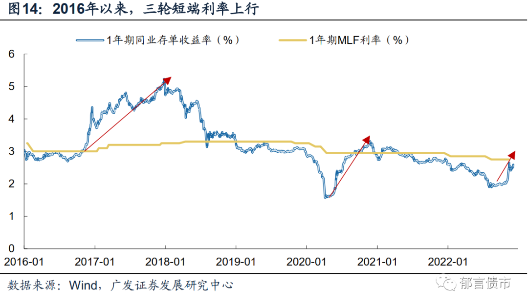 历史上两轮短端利率上行回顾。2016-2021年,1年期同业存单利率大幅上行,主要有两个阶段,一是2016年四季度至2018年初,1年期存单利率从2.69%升至5.23%,上行幅度达到254bp,而这一轮加息周期中MLF利率上调幅度仅30bp。1年期存单利率的高点,相对MLF利率高近200bp。二是2020年5月至11月,1年期存单利率从1.56%升至3.31%,上行幅度达到175bp。期间MLF未加息,1年期存单利率的高点,相对MLF利率高出36bp。