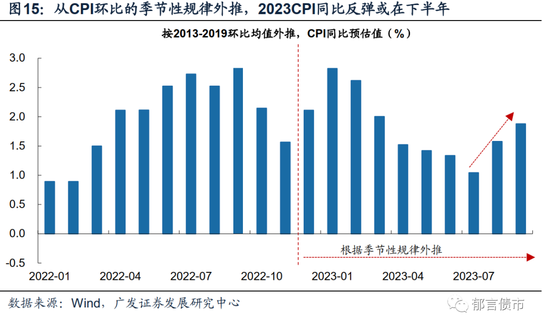 此外,2023下半年PPI也可能反弹,与CPI反弹形成共振。从翘尾因素来看,PPI同比有可能在二季度见底,下半年或趋于回升。假设CRB维持2022年11月的水平,由此计算2023年CRB同比,得到的结论与PPI翘尾因素类似。如2023下半年出现PPI、CPI同步上行,可能加剧债市对通胀风险的担忧。