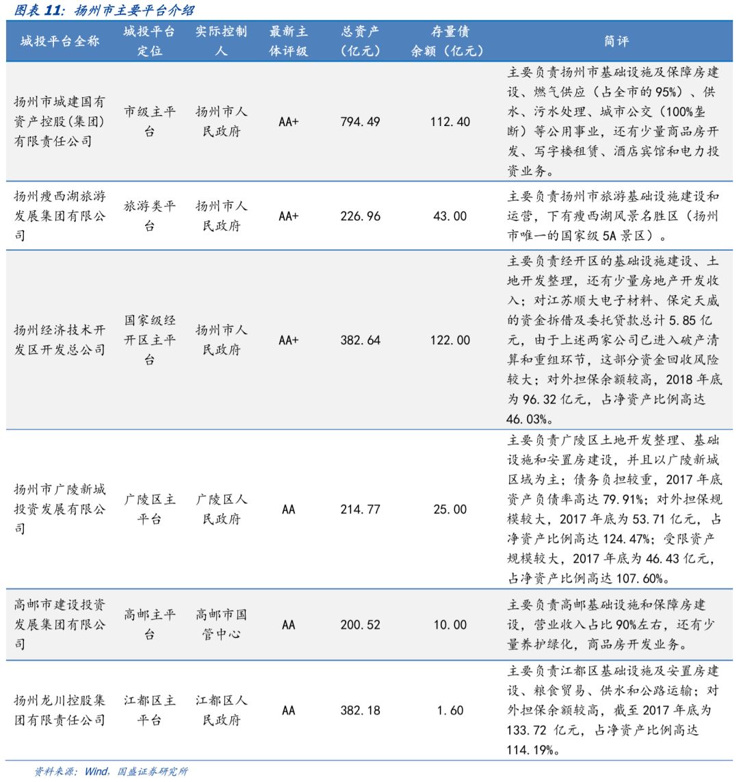扬州市位于江苏省中部,处于长江与京杭大运河交汇处,是江苏长江经济带重要组成部分。下辖邗江区、广陵区、江都区3个市辖区,高邮市、仪征市2个县级市,宝应县1个县。此外,还有扬州经济技术开发区、扬州高新技术产业开发区等。一共有18个发债平台,主要平台简评如下。