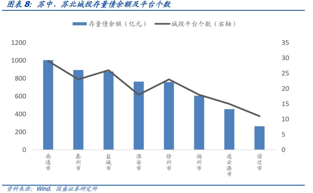 城投平台个数从大到小依次为南通市29个、盐城市26个、泰州市23个、徐州市23个、扬州市18个、淮安市18个、连云港市15个、宿迁市11个。
