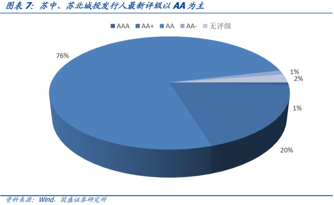 按照Wind口径,在人工剔除明显不是城投平台的公司,截至2018年6月30日,苏中、苏北城投平台存量债余额为5471.92亿元,涉及发行人163个。从发行人最新评级来看,AAA级有1个、AA+级有32个、AA级有124个、AA-级有2个、无评级有4个,以AA级为主,占比76%。