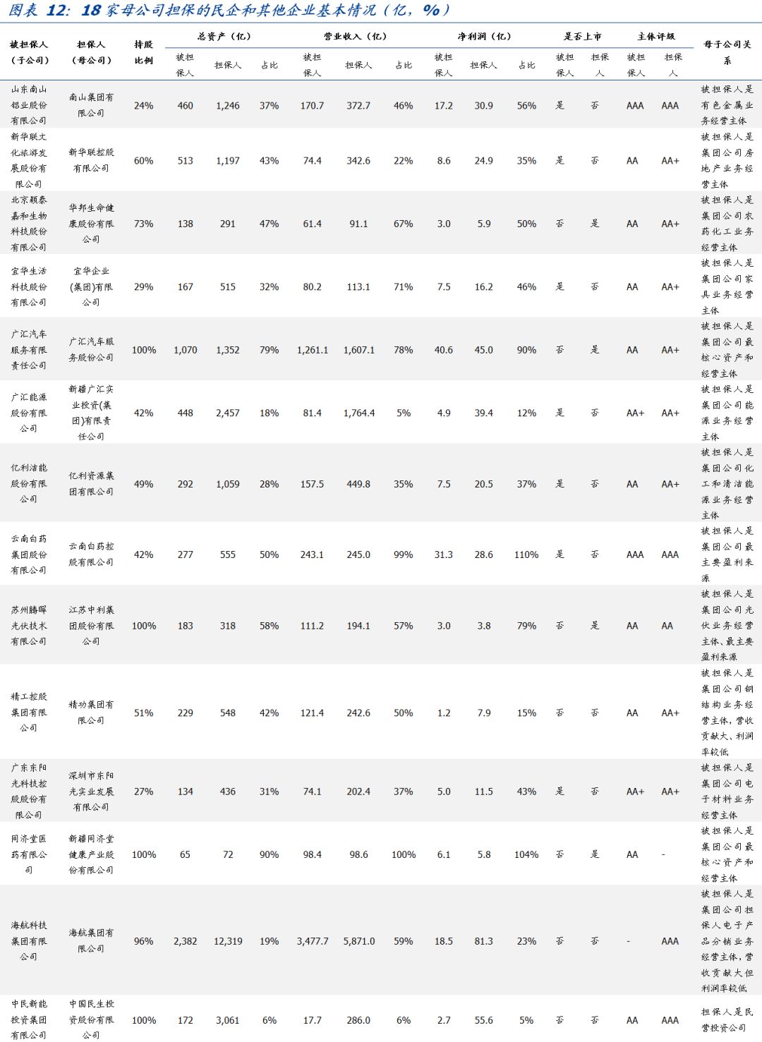 我们依据母公司担保分析框架,对数据可得的18家母公司担保的民企和其他企业进行数据挖掘和简要梳理。图表12反映子公司(被担保人)在集团中的地位,图表13反映集团公司整体负债水平和融资能力。