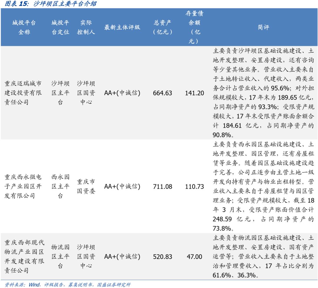 平台概况方面,沙坪坝区共有4个平台,分工区域各有侧重。其中,重庆西永微电子产业园区开发有限公司实际控制人为重庆市国资委,主要负责西永微电子产业园区的基建及土地开发整理;重庆迈瑞城市建设投资有限责任公司、重庆西部现代物流产业园区开发建设有限责任公司和重庆共享工业投资有限公司实际控制人均为沙坪坝区国有资产管理中心,分别负责沙坪坝区、物流园区和工业园区的基建及土地开发整理等业务。